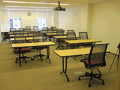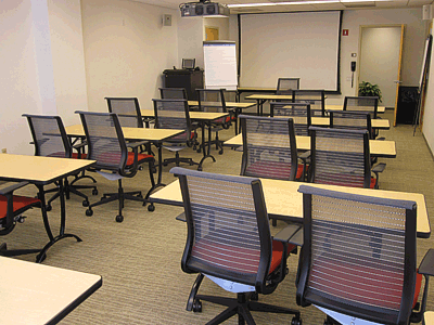Classroom C is a small to medium sized room that can accommodate up to 25 persons, depending on its configuration. It comes equipped with ceiling mounted bidirectional LCD projector, AV cart containing a computer, DVD/VHS player, and connections for attaching your own personal computer or audio device*.