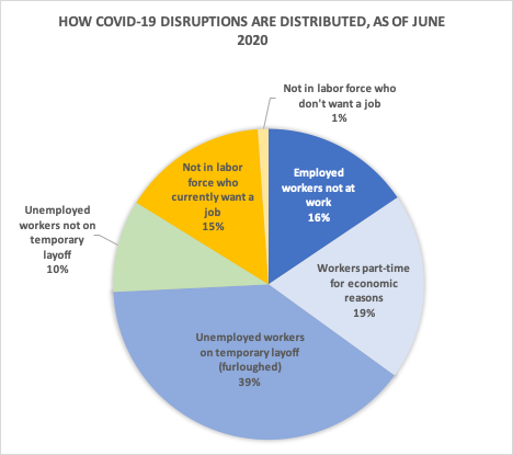 - Ongoing disruptions. The third and fourth columns of table show that in June, COVID-19 was still disrupting the jobs of over 24 million workers (about 15 percent of the labor force in February). The pie chart shows the percentages in the fourth column of the table.